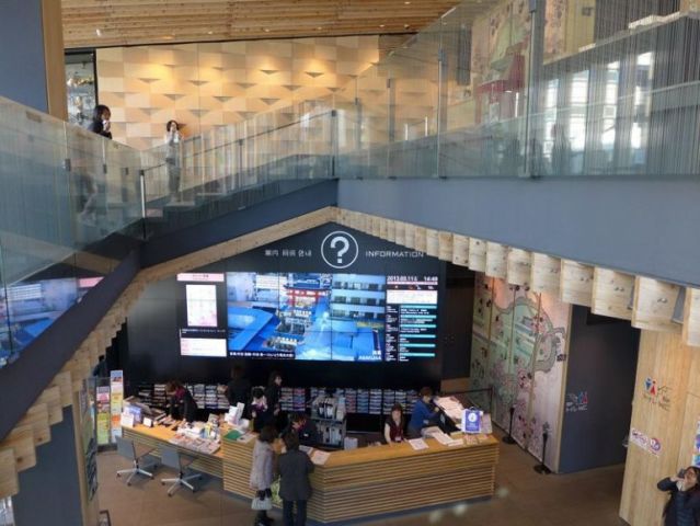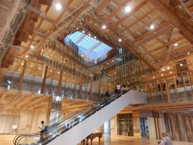 北陸地方の富山県にあり、ガラス美術館や図書館が入る複合ビル、「TOYAMAキラリ」。木材を使い、広い吹き抜けから差す自然光が明るく開放的な建築です。