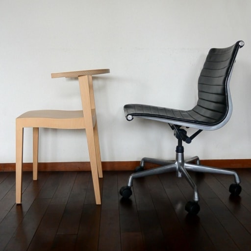 積層合板の断面が美しく、軽量の「エアコアチェア」は来客や食事に、形の美しさが気に入っている「アルミナムチェア」はおもにワークチェアとして使い分けているそう。