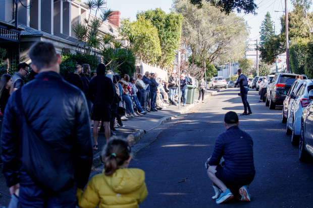 Onlookers gather to watch 42 Lawson Street, Balmain, go to auction on Saturday.
